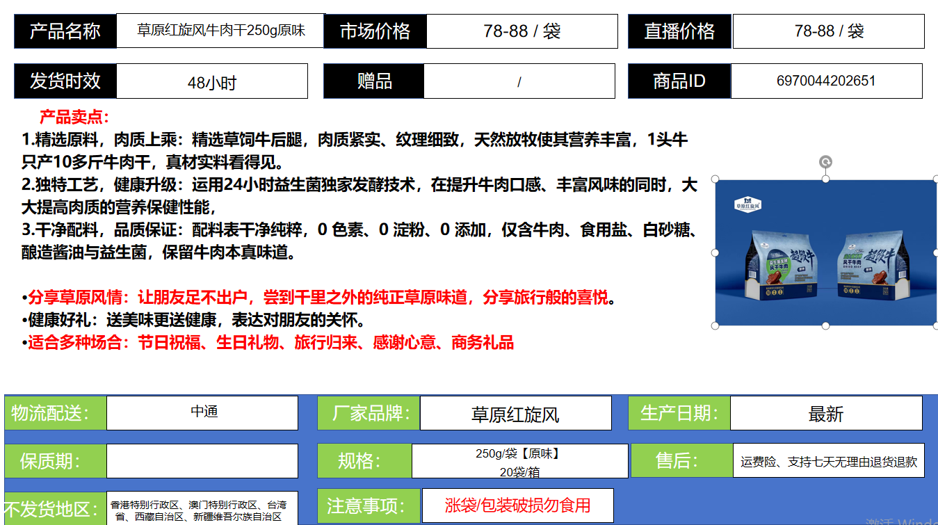 草原红旋风牛肉干250g原味